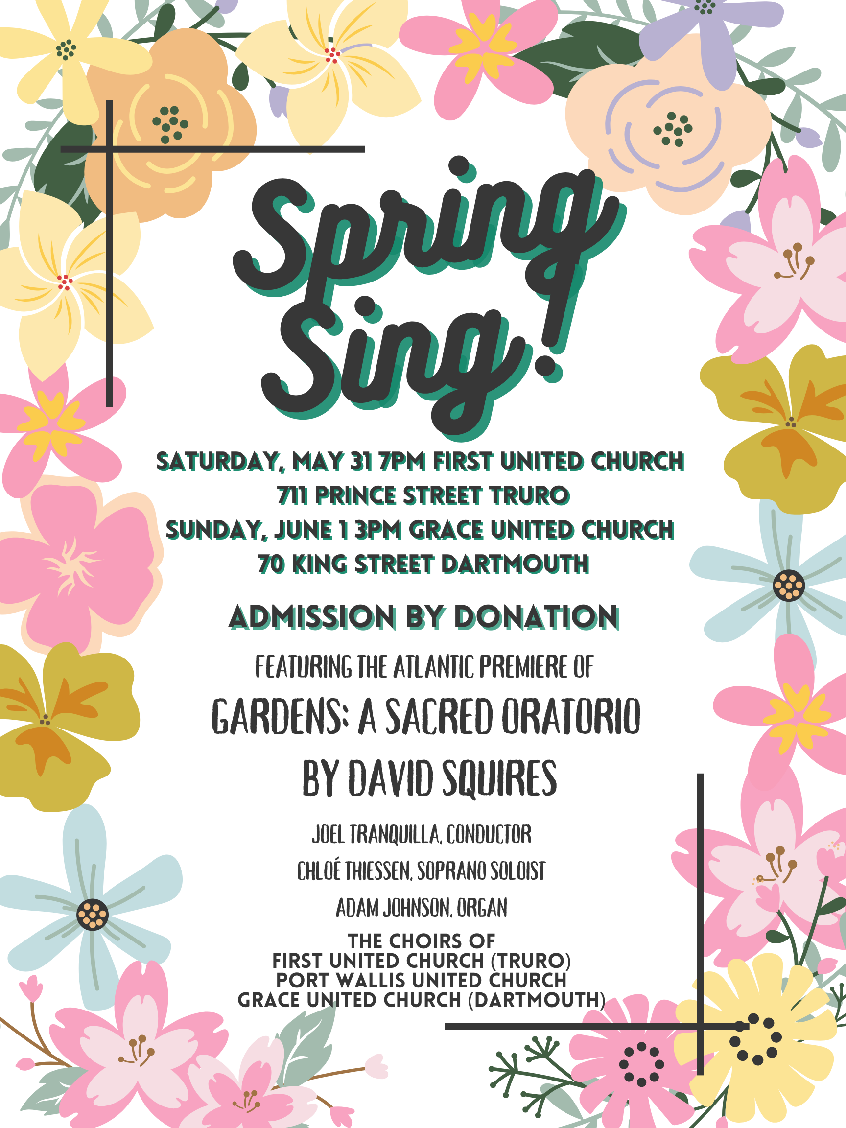 On Sunday, June 1, 2024 at 3pm the choirs of First United Church (Truro), Grace United Church and Port Wallis United Church offered a program featuring the Atlantic premiere of Gardens: a sacred oratorio by David Squires. Ms ChloƩ Thiessen was the soprano soloist with Adam Johnson on the organ and Joel Tranquilla conducting.